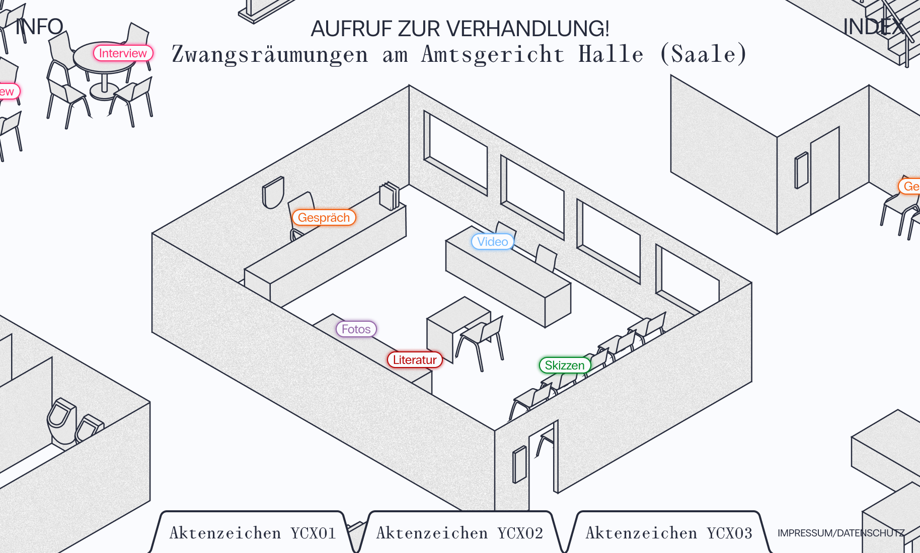 Unsere Beobachtungen und Recherchen zu Enmietungsprozessen versammeln wir in einem digitalen Story-Mapping. Es umfasst eine Sammlung an Erzählungen, Darstellungen und Recherchematerial sowie verschiedene Visualisierungen, die versuchen die Atmosphäre, Betroffenheit und Machtdimensionen im Gericht erfahrbar zu machen. “Aufruf zur Verhandlung” ist eine Gegenerzählung, die der Entmenschlichung nüchterner Gerichtsprotokolle entgegenwirkt – ein Plädoyer für eine gerechtere und solidarische Wohnungspolitik.