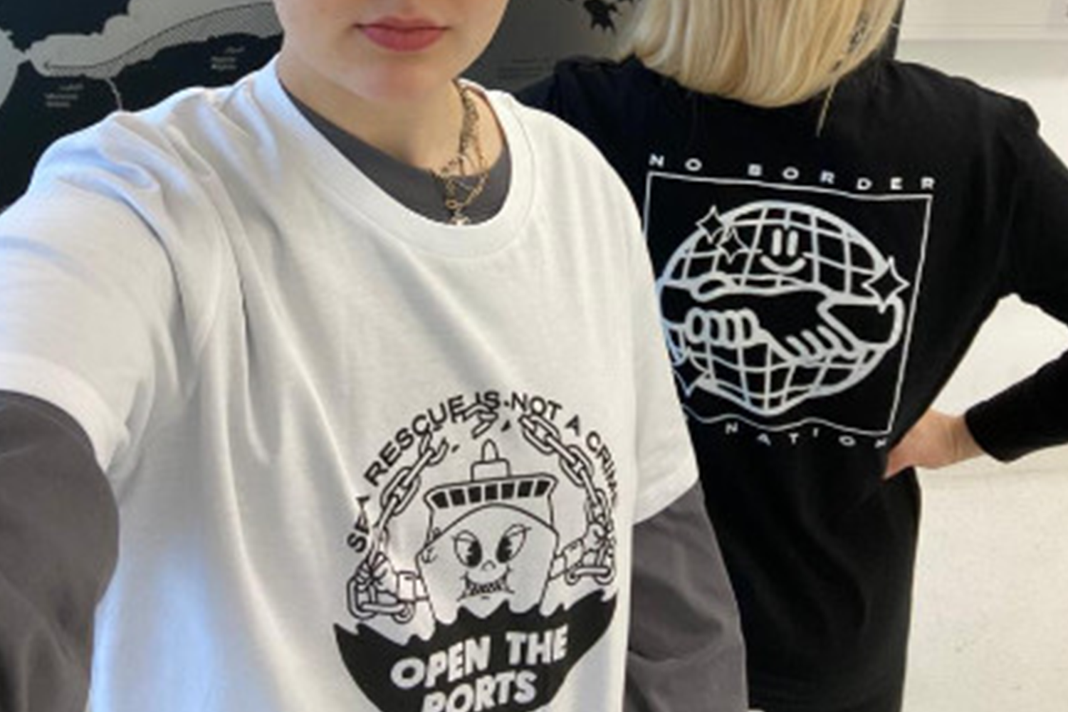 The requested cooperation was relatively open. Due to time and capacity constraints, we decided to design merchandise for LNOB’s online store in a two-day workshop. It seemed to make sense to us to design T-shirts, as these make up the majority of the online store and, from experience, generate more attention. Based on the demands #LNOB formulates, motifs were created during the workshop that also address our cooperation with Sea-Watch. After we made a selection in exchange with LNOB, we decided to produce the shirts ourselves in a small edition of 36 pieces using screen printing and to sell them during the presentation.