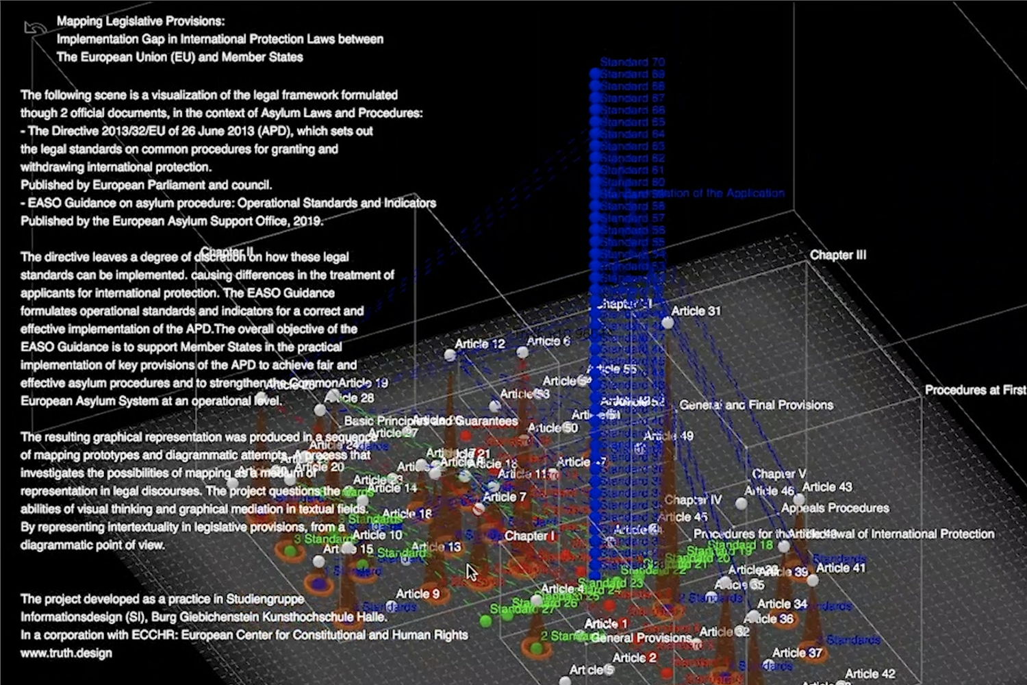 In the context of asylum cases in the EU, mechanisms of law remain ambiguous in their language, structure and logic. My approach is an attempt to represent the law beyond its textual facade, while raising critical questions on the court procedures and its decision making process in asylum cases. Can data maps offer a hybrid medium for countering legal procedures or for elaborating fragments of legal double standards? Do arbitrary decisions exist in the legal mind? What roles can data maps play in investigative journalism and legal activism? Can data maps frame critical patterns in legal decision-making?