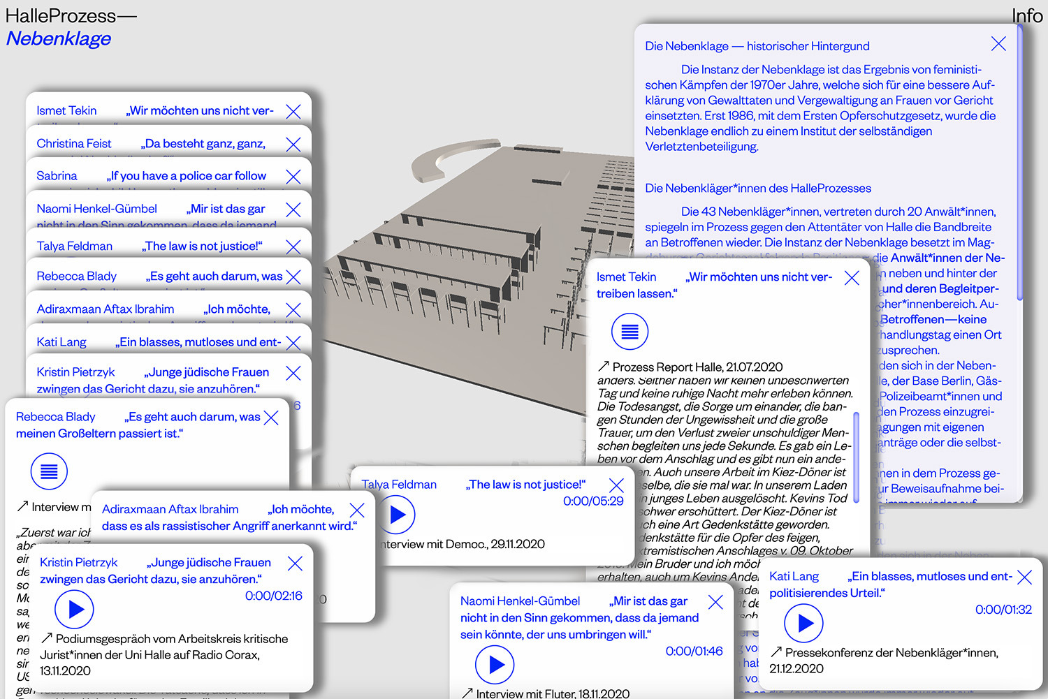 A website collects voice and text statements by the co-plaintiffs. The website uses a 3D model of the spatial setting in the courtroom as an immersive interface to connect voices and statements by co-plaintiffs to their spatiality and location within the courtroom. Who sees whom within the courtroom? Which perspectives are possible and which are hindered? How does this affect the public perception of the trial by the images possible?Using this model as a structure to ask questions about the correlation of spatiality and media publicity aims at making the non-neutrality of court spaces visible and discussable. Through this, the project proposes focusing on the voices and opinions of those affected.As in the case against the aggressor of Halle, 2019, he live-streamed his attacks to the gaming platform Twitch, the court case was not about basic guilt, but vastly about how the public perceives and negotiates the case. Therefore the project also aims at proposing other forms of focusing on the voices of those affected in those cases.