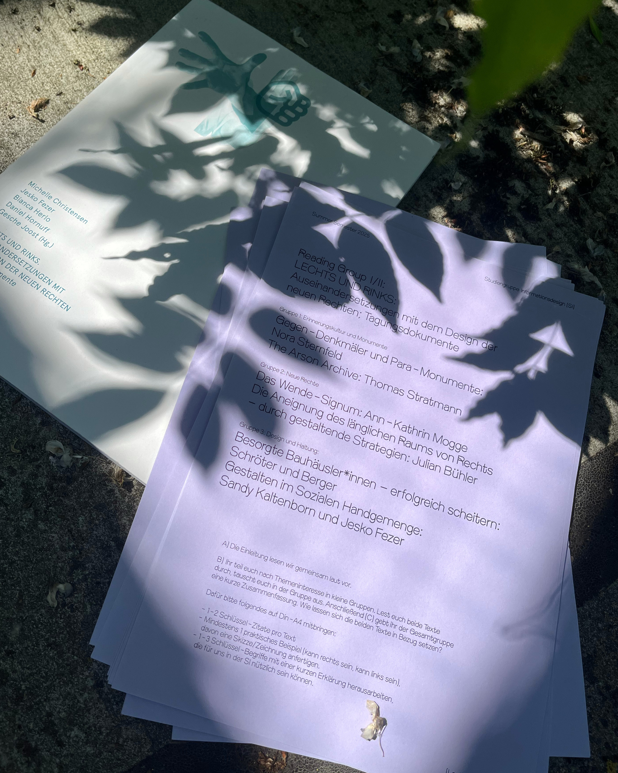 An zwei Terminen dieses Semester haben wir Texte aus der Publikation „LECHTS UND RINKS“ kollektiv gelesen. Die Texte wurden praxisbasiert besprochen. Wir beschäftigten uns mit Erfahrungen und Fragen, die sich auf unsere eigene Designpraxis und Referenzprojekte beziehen. Die Reading Group war dieses Semester sowohl für die Master-Studierenden, als auch für die Bachelor-Studierenden und Gäste ausgelegt.