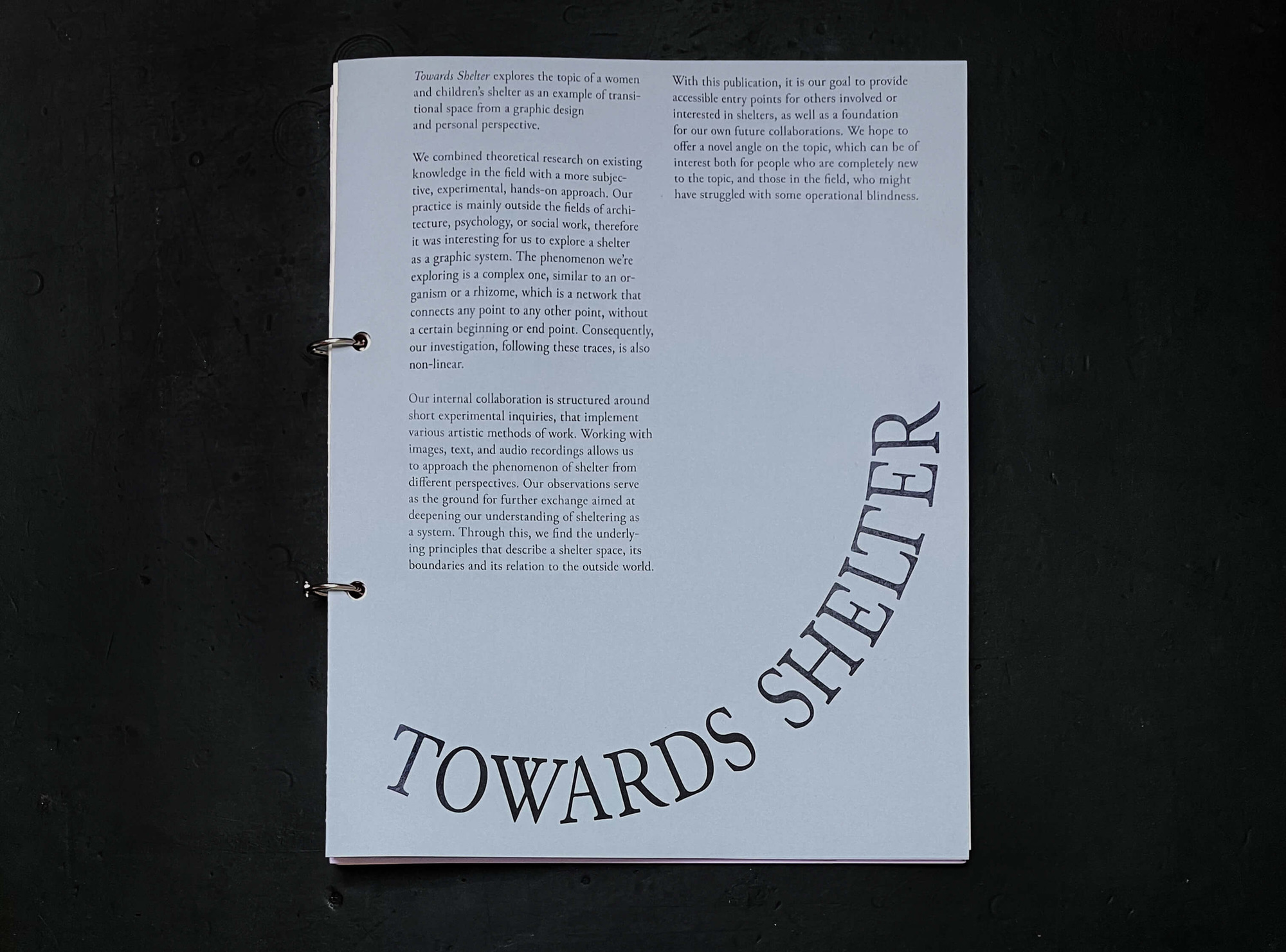 Towards Shelter explores the topic of a women and children’s shelter as an example of transitional space from a graphic design and personal perspective.